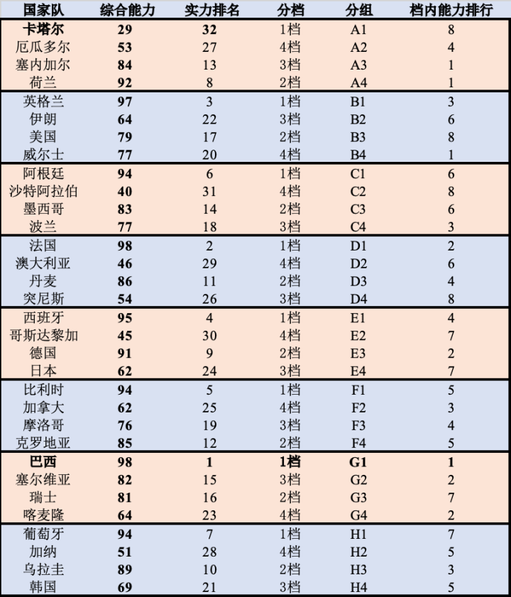 笔者按照2021年3月31日FIFA国家队排名和Transfer Market国家队身价两方面,以一定的加权系数和换算关系计算出世界杯32强的综合能力(由于其复杂性和无聊性,略过其计算过程,结果只代表个人片面观点,不完全反映球队的实际能力):