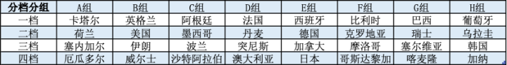 国际足联对抽签分档的规则是按照出线球队在3月末的排名进行,一档为东道主卡塔尔加上前7名,以此类推,四档则是6月参加附加赛晋级的3支球队加排名最后的5支球队。最终分档情况如下: