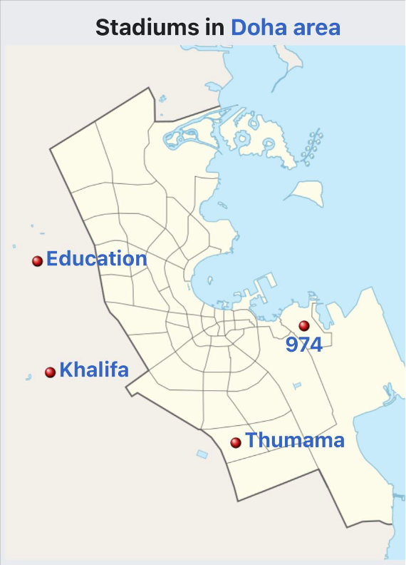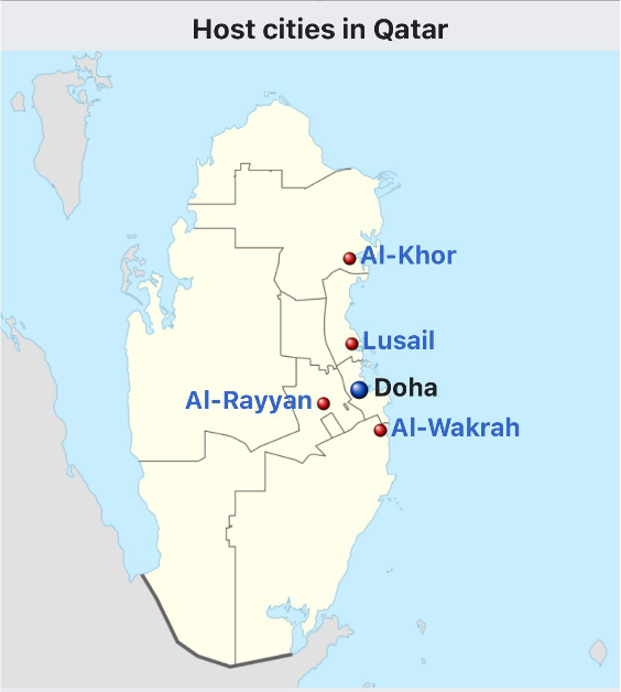 本次世界杯的64场比赛将在卡塔尔的5个城市8个球场进行: