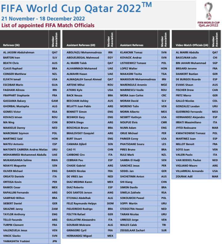 卡塔尔世界杯裁判名单由36名主裁判、69名助理裁判和24名视频助理裁判组成。在这份裁判名单中,共有6名女性裁判员(三名主裁判、三名助理裁判),这也是史上首次有女性裁判参与男足世界杯的执法工作,其中包括法国“明星女裁判”史蒂芬妮、日本女裁判山下良美。男性裁判包括本赛季欧冠决赛裁判克莱门特·特平、西甲最佳裁判“小公主”拉奥斯、英超著名裁判安东尼·泰勒等。