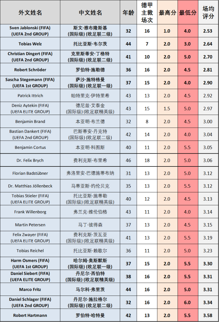 熟悉德甲打分体系的球迷朋友们可能知道,一场比赛下来,球员得分越低就意味着表现越好,裁判也是如此。《踢球者》每场比赛都会给裁判组的表现评分,从1-5分不等,3.0分为正常水准,1.0/1.5分代表世界级发挥,4.5/5.0分则为不及格。让我们看看本赛季德甲裁判的得分情况: