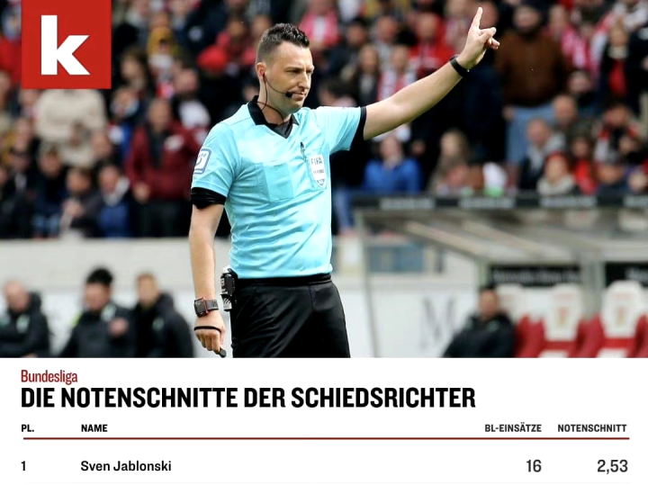 在本赛季的德甲联赛中,2022新晋国际级裁判员斯文·雅布隆斯基无疑是“最强黑马”。雅布隆斯基在其执法的16场德甲联赛中仅有1场得到了4.0的“低分”,外加3场3.5分,其他12场比赛均稳定保持着高于平均水平的发挥,甚至在最后一轮勒沃库森2:1弗赖堡的欧冠名额争夺焦点战中收获了1.0的世界级评价(本赛季唯一一场裁判员获得1.0超高分的德甲比赛)。最终,雅布隆斯基以均分2.53的成绩排名第一,其身后的韦尔茨、丁格特、施勒德、施特格曼、伊特里希、艾泰金等裁判员的均分也都在3分以下。