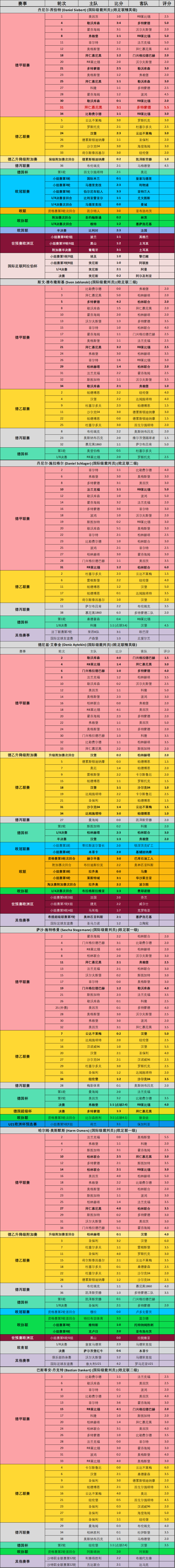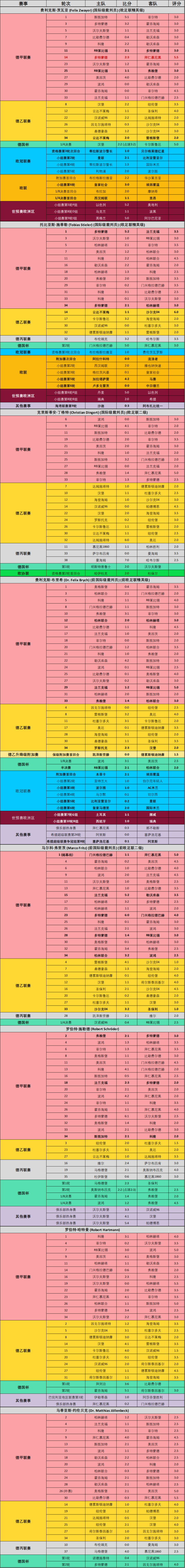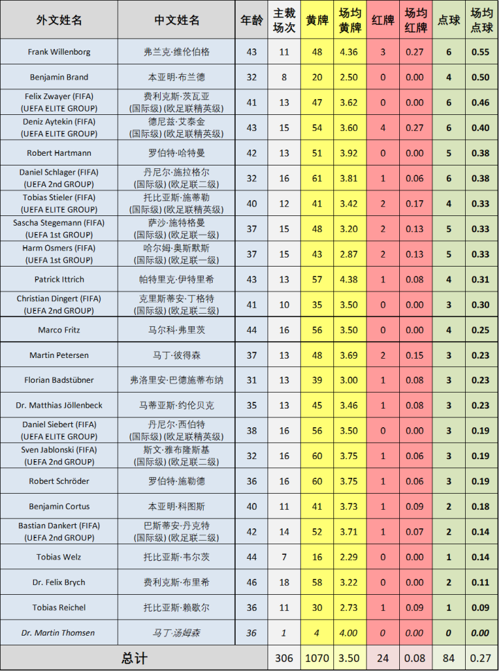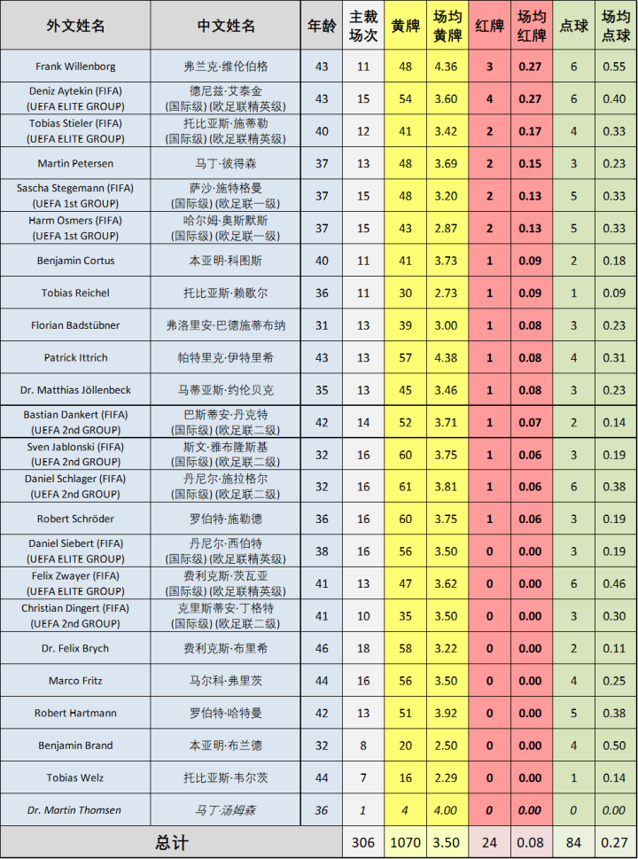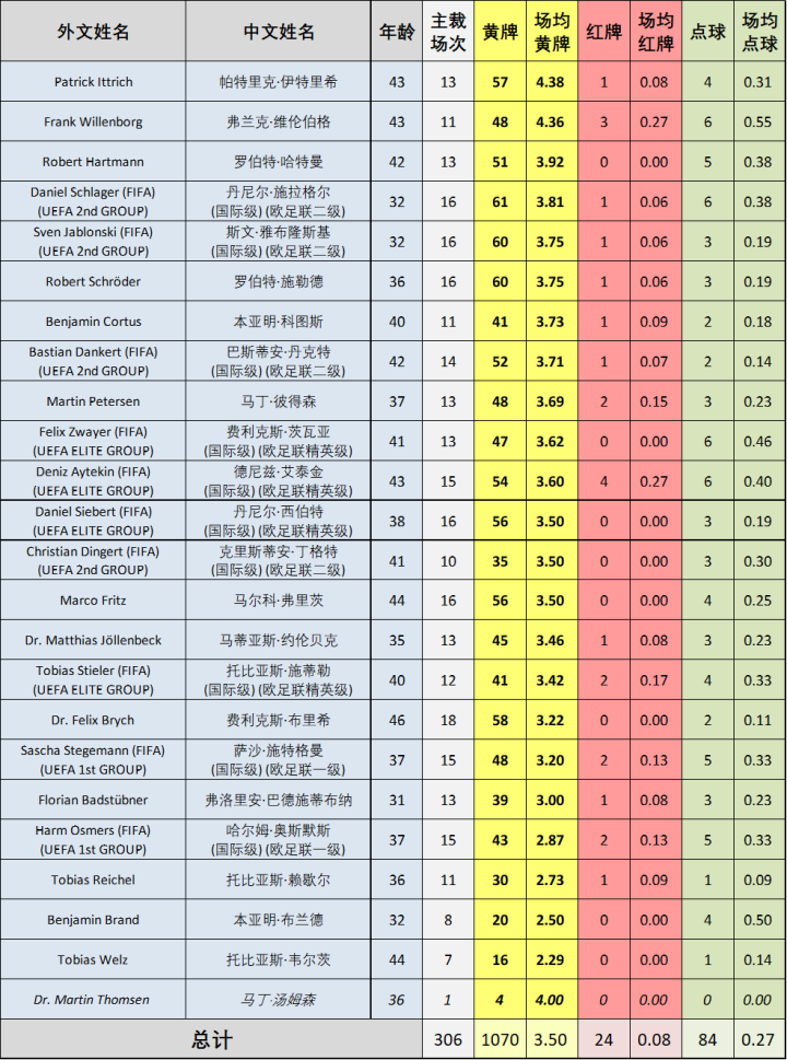 现已被推上“德国国哨”宝座的西伯特同样发挥不佳,仅排在倒数第四的位置。在欧冠屡造争议的西伯特回到国内依然延续了极差的状态,吹毁了国家德比、勒沃库森3:4多特蒙德、弗赖堡1:1莱比锡等重头戏,好在最终的德乙-德丙升降级附加赛次回合比赛救了他一命,给这个充满争议的赛季画上了一个相对圆满的句号。把名字遮住,你绝不会相信这是新一代“首席裁判”交出的成绩单。