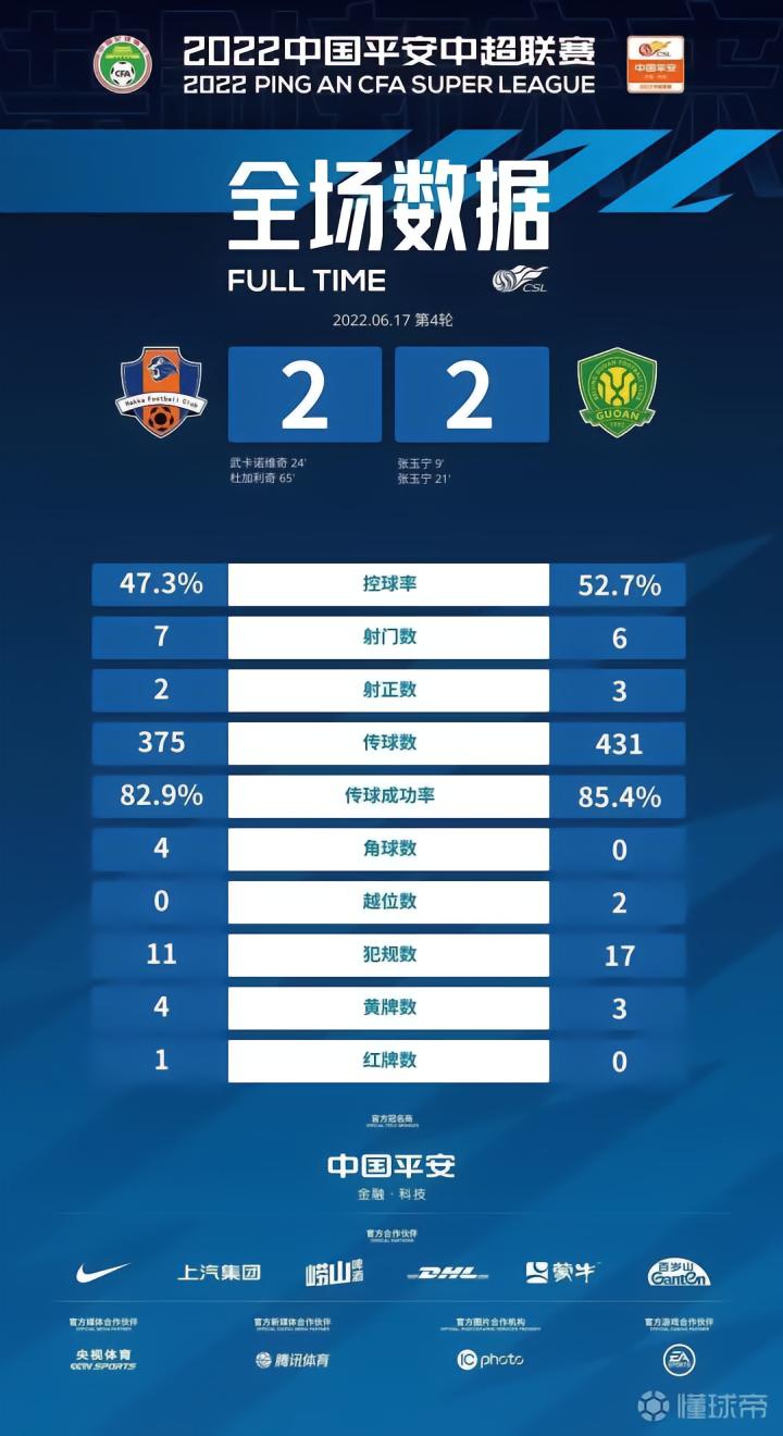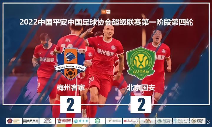 耀武酒肆工作室6月17日19:30,中超第4轮,梅州客家对阵北京国安。上半场,北京国安张玉宁梅开二度,武卡诺维奇扳回一球,晋鹏翔和杨一虎相继伤退,杨超声两黄被罚下,梅州客家只有十人应战。下半场,阿德本罗拉伤被换下,侯森扑出武卡诺维奇单刀射门,杜加利奇头球追平比分。90分钟战罢,梅州客家2-2战平北京国安,各取一分,同时梅州客家杜加利奇获本场比赛最佳球员。南派足球加上坚韧的球风,梅州客家给中超联赛注入一股新风。