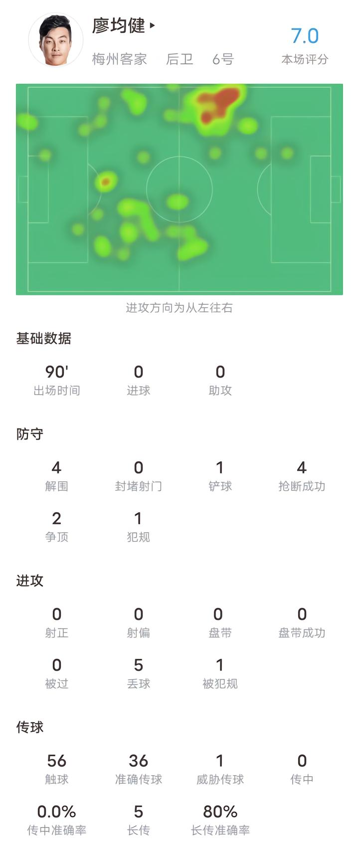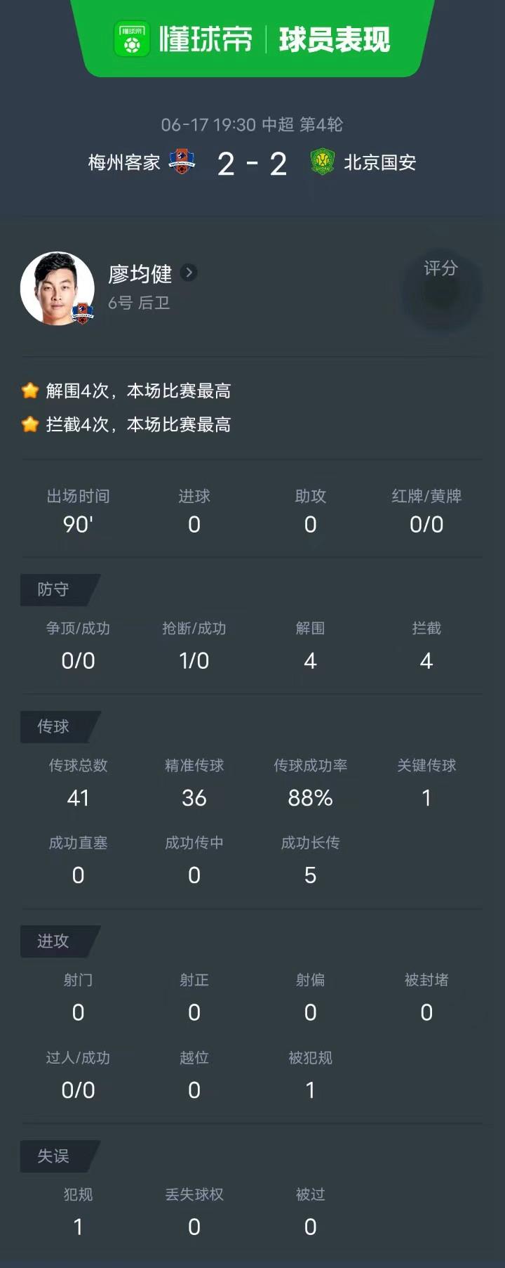 广西北海籍球员廖均健代表梅州客家首发出场打满90分钟,他司职中后卫,得到7.0的评分,全场他解围4次、拦截4次,均是全场最多,送出36次精准传球,成功率达88%,贡献一次关键传球和5次成功长传,廖均健在攻防两端均有出色发挥,在球队少打一人的不利局面下,他顽强铁血的意志品质发挥了巨大作用,多次送出关键解围和拦截,帮助球队下半场零封对手,顽强逼平强大的北京国安。