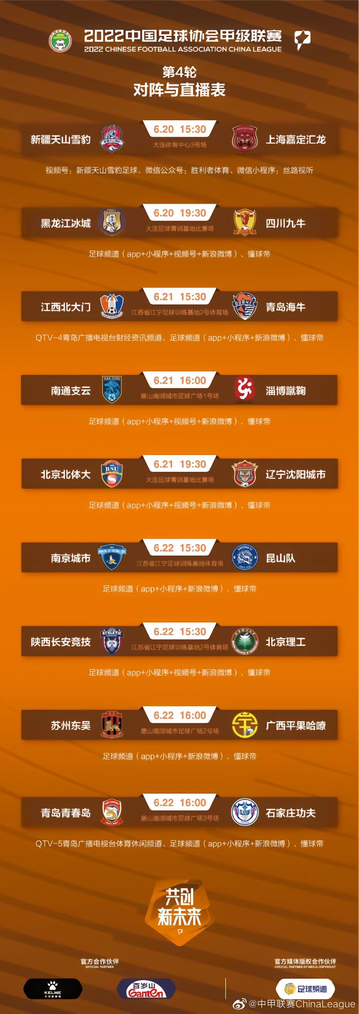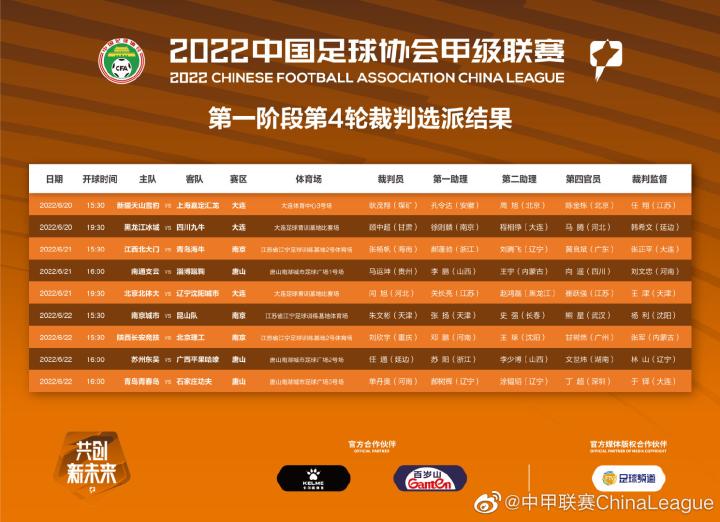 6月20日-22日,2022赛季中甲联赛第一阶段第4轮将在大连、南京、唐山赛区进行。赛前,中甲官方发布了本轮对阵和转播安排,以及裁判选派名单。