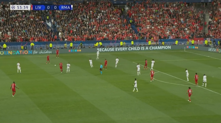 但皇马并未因为差点丢球而方寸大乱,他们甚至没有表现出哪怕一丝慌张,仍旧十分镇定的站位防守,没多久就把节奏重新降下来。他们无所谓控球,让红军尽管挑战自己的防线,即使拿到球也是在后场耐心传导,并不执著于提速反击,除非中前场特别开阔,才会来上一脚打身后的长传。