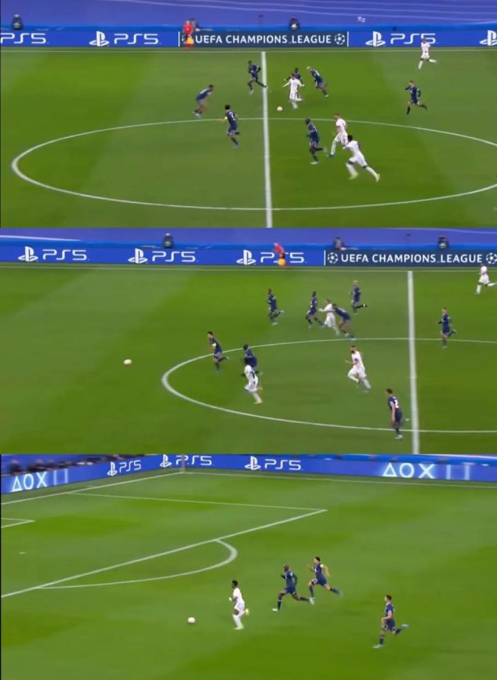巴黎禁区足足站了有7个人,但他们明显被反击弄得惊魂未定,先是注意力全在维尼修斯,后又全部转向魔笛,魔笛一个侧身让他们以为要传球下右底,完全没有去注意,维尼修斯带球时冲过头的本泽马已经悄然回撤到了不越位的禁区腹地。