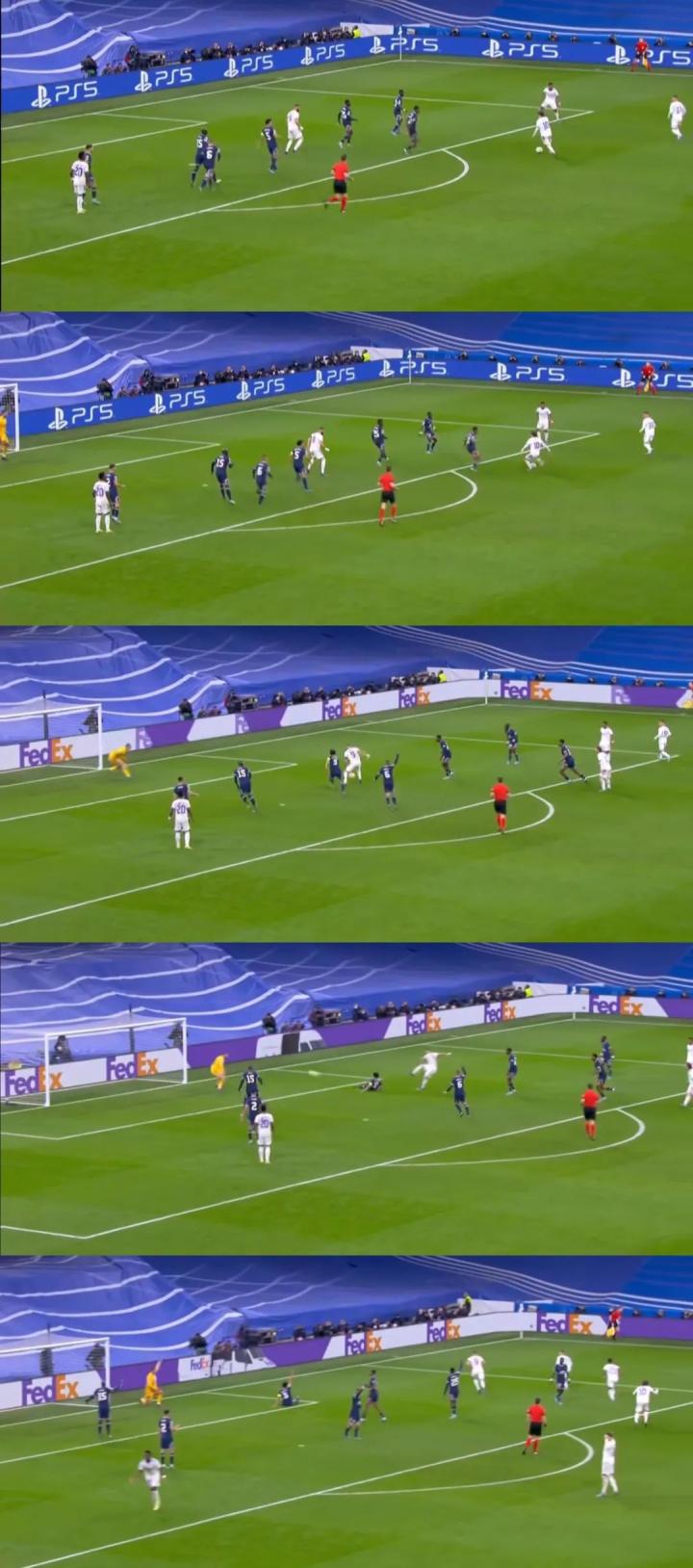 本泽马一直望向魔笛,魔笛两秒不到的时间里,掐准时机又是一个销魂的关键传球。马尔基尼奥斯发现不对但为时已晚,笨马劲射折线后得分。