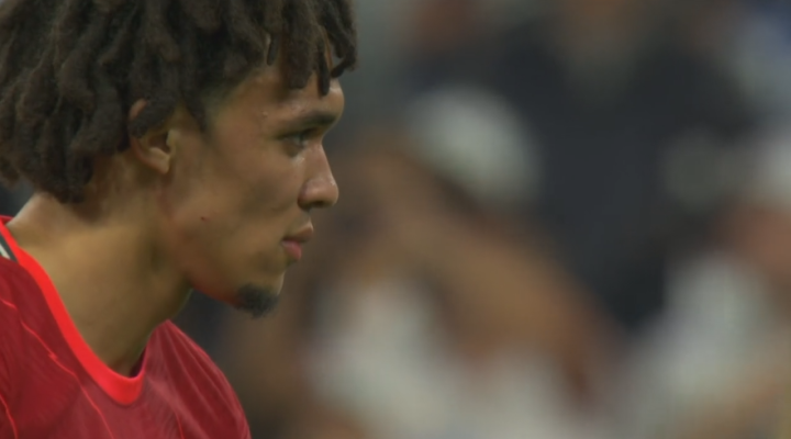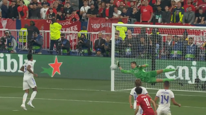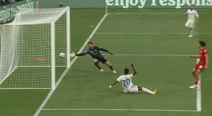 萨拉赫积极中带着些许焦躁的连打两脚门,无奈看着阿拉巴、门迪、米利唐三人组墙封挡。不久,皇马获得反击良机。巴尔韦德右路拉边突破,瞄准远端送出穿越快传,维尼修斯只需碰到皮球让其变线足矣。皇马出现机会便一剑封喉,比分领先。