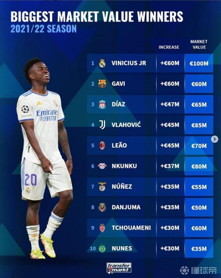 皇马前锋维尼修斯身价上涨了6000万欧元,现身价为1亿欧元,17岁的加维则是第一次在德转更新身价,身价为6000万欧元。这份榜单前十名的球员,年龄都没有超过25岁。