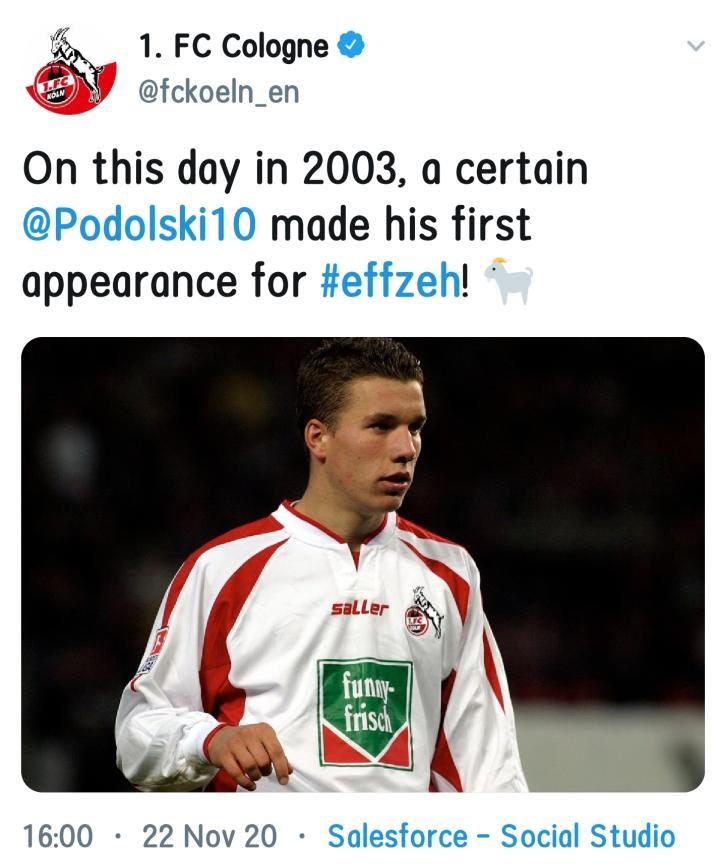 17年前的2003.11.22,是波多尔斯基首次以科隆成年队身份踢德国甲级联赛的日子,当时波尔蒂在社交平台发布信息,表示纪念!也藉此表达对母队永恒的爱!❤