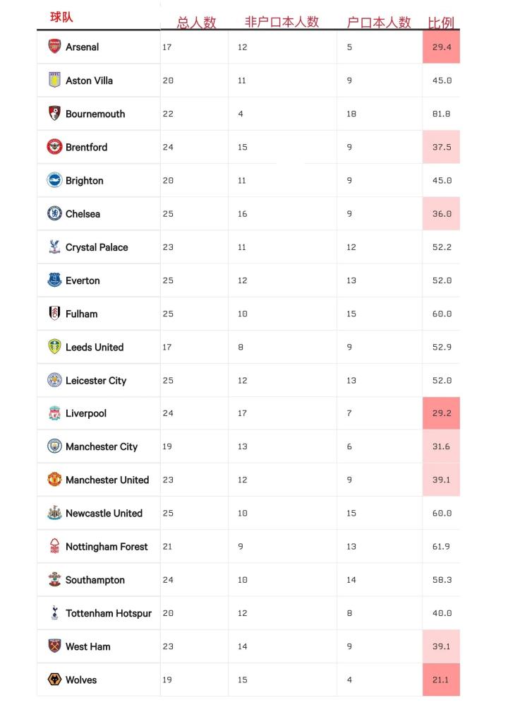 升班马球队都没有非“户口本”超编问题,这很合理。上赛季,伯恩茅斯队中只有4名非“户口本”球员。除了升班马,纽卡斯尔的“户口本”球员占比最高,达到60%。