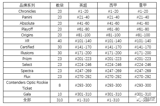 共8个,基本都是Base名单中存在的品牌,Base List中各联赛名单分布数量是一致的,但在物料名单中就参差不齐了,物料名单总卡量是139,各品牌中英超的卡量相对更多一些,具体如下: