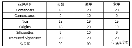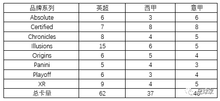 签字名单总卡量为287,相当庞大,各品牌在各联赛中的卡量分布如下:
