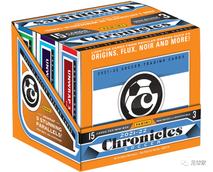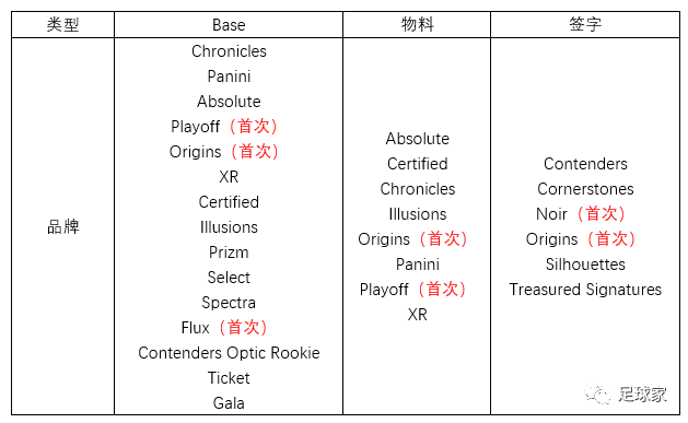 足球编年史的元年系列始于2019-20赛季的版本,今年的2021-22版是系列第三款卡盒。根据Panini公布的21-22足球编年史具体名单和配置上来看,加入的品牌(系列)阵容可谓是空前强大,Base名单中加入的品牌(系列)有14个、物料名单有8个、签字名单则为6个,独立品牌共18个。其中Base品牌的Playoff、Origins、Flux都是首次加入,签字品牌的Noir也是首次加入。篮球卡的起源(Origins)风格很让人眼馋,而这次编年史中Base、物料和签字名单里的Origins将能让足球卡迷们也体验到起源那精美的设计,Origins也是这次足球编年史唯一一个在Base、物料、签字名单中都有存在的品牌。