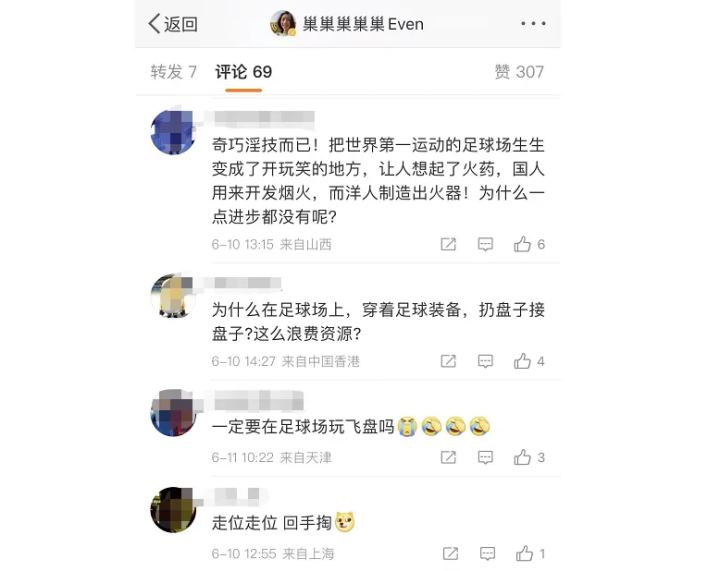 现在,有足球爱好者丑化飞盘运动为“奇技淫巧”(这词本意并非贬义,但被歪曲为贬义并用来形容男女共玩的飞盘了);有飞盘爱好者嘲笑踢球的油腻大叔管得真宽。