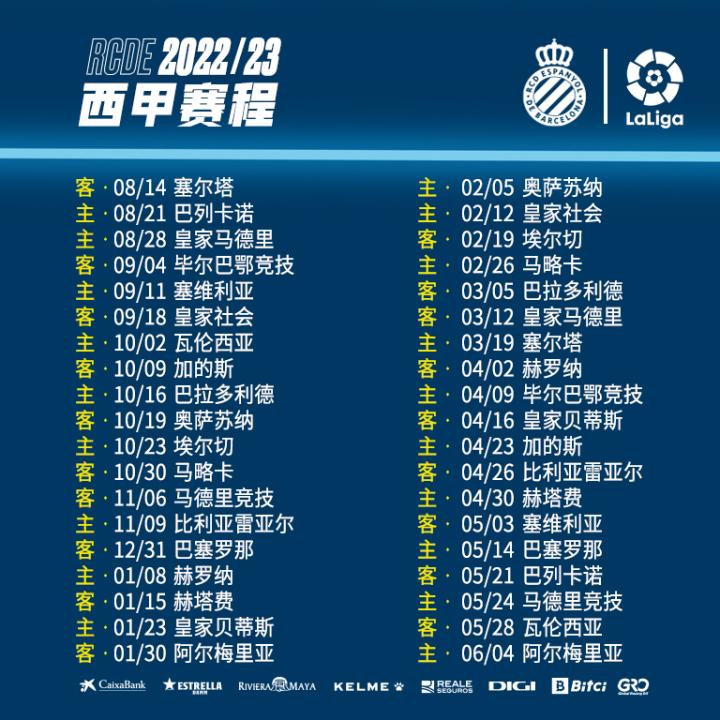 新赛季西班牙人西甲赛程完整版。 点击保存不迷路~