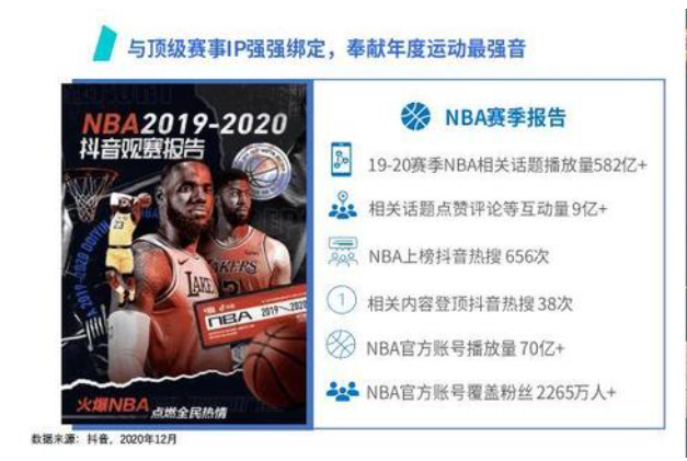 在拿下NBA版权后,2019-20赛季,抖音平台的NBA相关话题播放量超582亿;NBA官方账号播放量超70亿;NBA官方账号覆盖粉丝超2265万人。