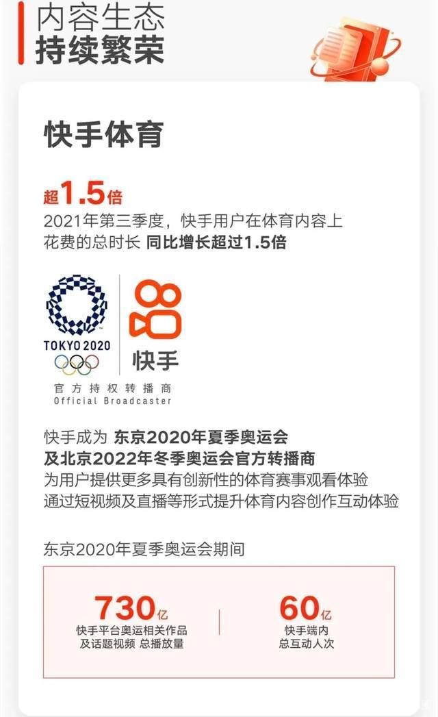 2021年5月21日,快手宣布获得2020东京奥运会与北京2022冬奥会视频点播及短视频权利。