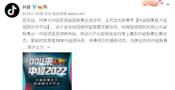 6月3日,抖音正式官宣,即日起与中国足球超级联赛达成合作,正式成为新赛季“中超联赛官方短视频合作平台”,双方会在短视频内容层面深度合作。