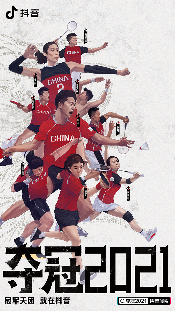而在东京奥运会和北京冬奥会上,抖音没有拿到转播版权,但是抖音集结了100+运动员、站内人气明星等阵容,推出“夺冠2021”、“冠军驾到”等内容专题页,以丰富的体育内容为观众呈现一场体育盛宴,获得用户的高关注和高讨论。