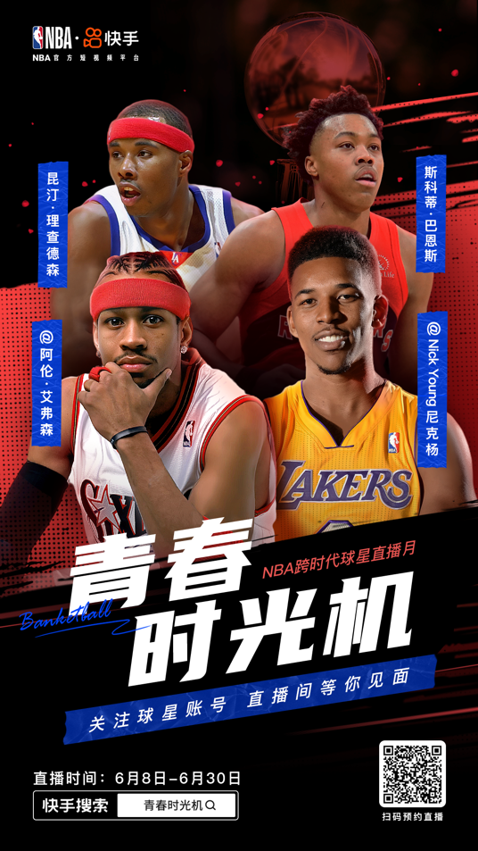 6月8日,快手开启了以“青春时光机”为主题的NBA跨时代球星直播月活动,“96黄金一代”状元阿伦·艾弗森,单打王尼克杨以及“大Q”昆汀·理查德森,多伦多猛龙前锋斯科蒂·巴恩斯等一众NBA球星都将在快手进行独家直播,不仅畅聊青春往事,还会发起花式篮球挑战赛,与广大球迷们开展亲密互动。
