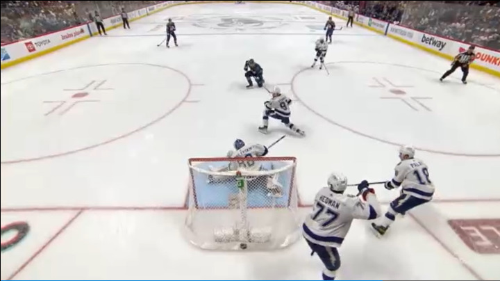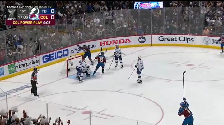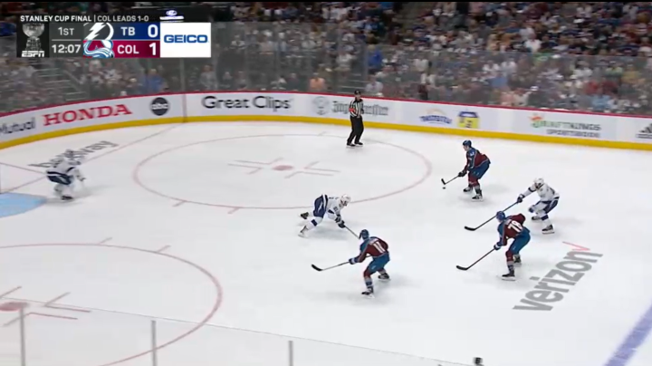 正是利用这次多打少,雪崩率先进球!多打少还剩7秒结束时,18号纽虎克在底板墙处回传右侧的95号布拉科夫斯基,后者往门前传球,13号尼楚什金用球杆一垫把球垫进球门!雪崩取得1:0领先的梦幻开局!