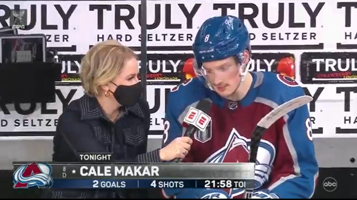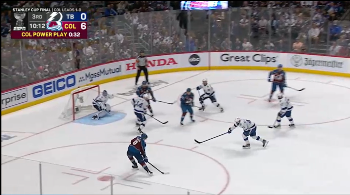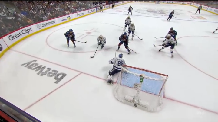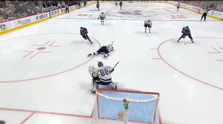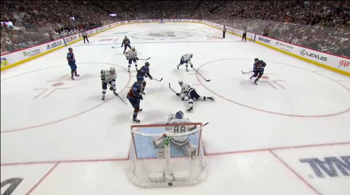 正是利用这次多打少,雪崩取得了进球!末节还剩10分11秒,麦金农将球交到马卡尔杆下,马卡尔回传麦金农,麦金农把球分到右路的兰塔宁,兰塔宁横传左侧,马卡尔面对来球直接挥杆射门把球打入球门左侧死角!这是一杆精准的One-Timer破门!雪崩打进本场第7球,马卡尔实现梅开二度!