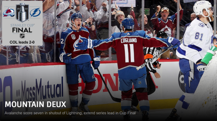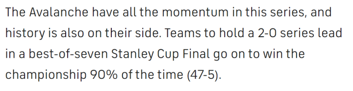 雪崩成为历史第五支在总决赛大比分2:0领先卫冕冠军的球队。此前四次分别为:1956年加拿大人领先红翼(最终加拿大人4:1夺冠)、1962年枫叶领先黑鹰(最终枫叶4:2夺冠)、1966年红翼领先加拿大人(最终2:4被逆转)、1976年加拿大人领先飞人(最终加拿大人4:0横扫夺冠)。