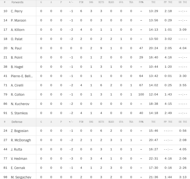 闪电队打得确实很不理想,但至少有几次射正,门将瓦西列夫斯基也得到了一点休息时间。进攻四组确实给进攻带来了转变,但尽管在攻区待了一段时间,他们还是没能进球。