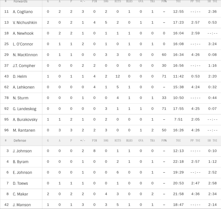 最终比赛结束,雪崩7:0完封闪电,取得第二场的胜利,大比分也以2:0领先。雪崩的射正数为30次,几乎是闪电(16次)的2倍。GAME 3将移师闪电主场坦帕湾进行。