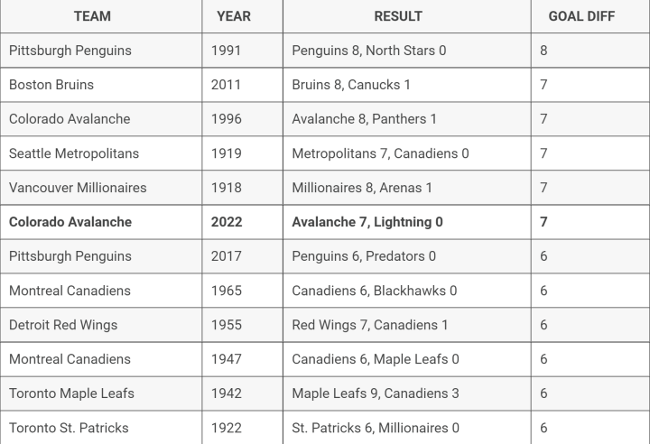 这是雪崩队史在总决赛赛场上第5次零封。在总决赛中,比雪崩完成更多零封的,有加拿大人(20次)、红翼(14次)、枫叶(10次,其中1次队名还是圣帕特里克斯)和棕熊(9次)。