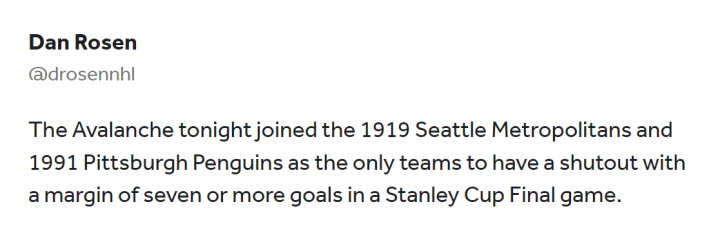 雪崩在总决赛前两场的首节都取得了3+进球,成为历史第三支做到这一点的球队。