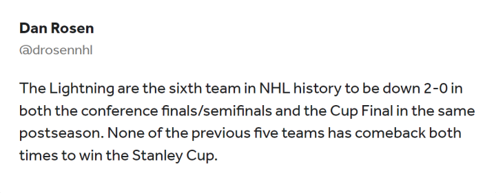 闪电成为历史第6支在单赛季季后赛中的分区决赛/半决赛和总决赛都以大比分0:2落后的球队。