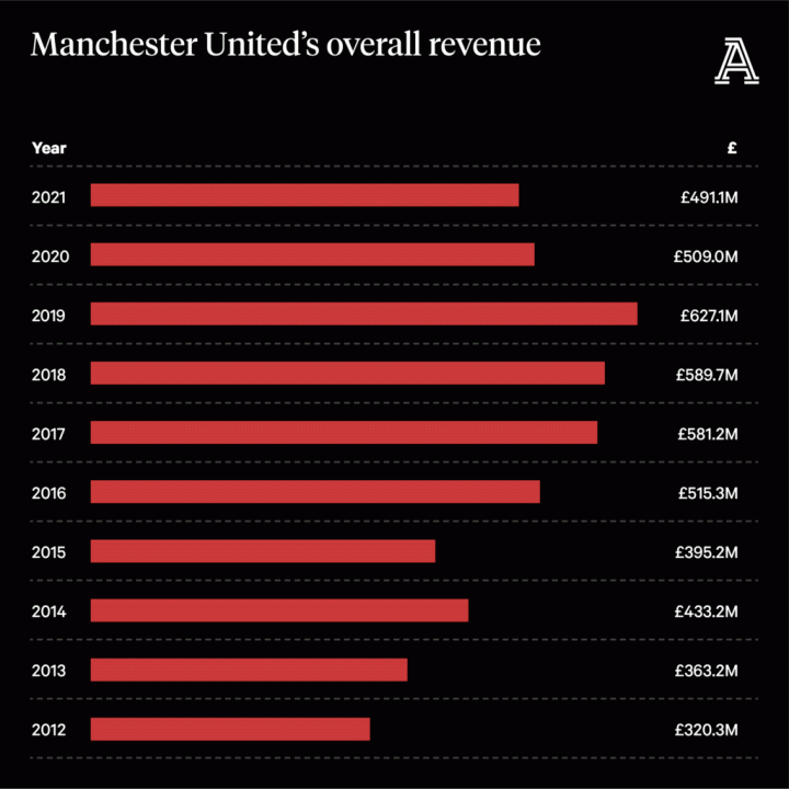 在过去的十年间,尽管曼联没能在场上持续取得成绩,俱乐部还是靠着辉煌的历史获取了巨额资金。