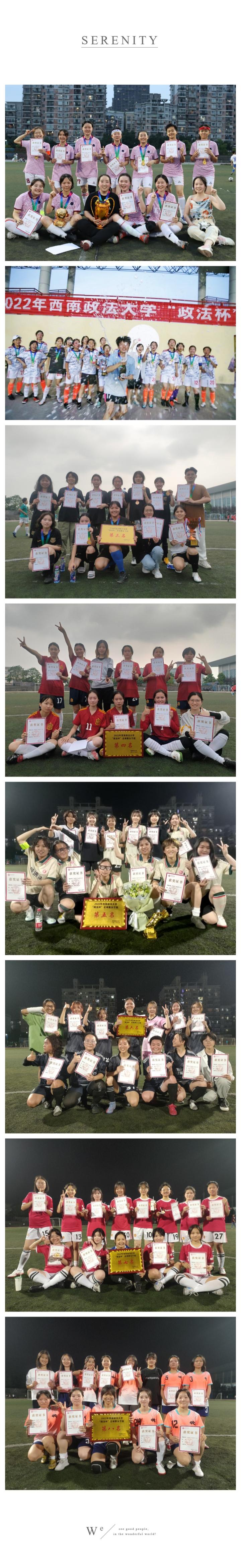 西政对内有着纷繁多样的校内比赛,对外校队的队员们也不甘示弱,代表学校多次取得优异的成绩。近五年中,西政男足在2017年获得全国大学生校园足球联赛重庆赛区亚军,2018年获五人制亚军,2021年再获亚军,今年七月,我校男足将会代表重庆征战全国大学生校园足球联赛南方大区赛,祝愿他们能够突破自我,取得好成绩!