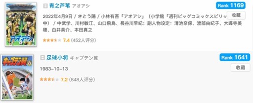 在国内知名动漫打分网站bangumi,《青之芦苇》比《足球小将》的评分高出0.2分