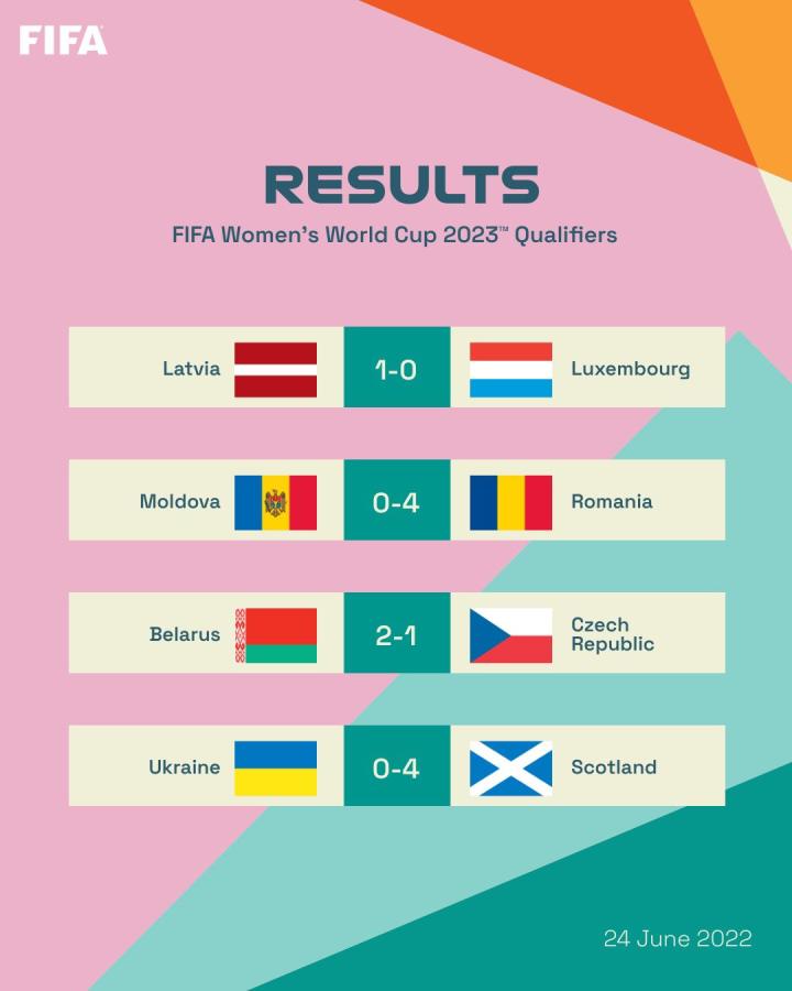 欧洲区女足世预赛回归(6月24-25日赛果): 保加利亚女足0-2以色列女足:两队均已无缘从H组出线,其中保加利亚遭遇八连败 拉脱维亚女足1-0卢森堡女足:D组这两队都已出局,拉脱维亚收获首胜 摩尔多瓦女足0-4罗马尼亚女足:摩尔多瓦七连败继续G组垫底,罗马尼亚剩两轮落后榜首的意大利5分,还有机会 白俄罗斯女足2-1捷克女足:捷克输球后被淘汰,白俄剩3轮落后C组头名的冰岛8分,还有机会 乌克兰女足0-4苏格兰女足:西班牙已经拿到B组第一晋级女足世界杯;苏格兰剩1场比赛,乌克兰剩3场,两队相差9分、苏格兰相互战绩占优,因此乌克兰提前出局,苏格兰暂居次席,领先还剩两轮比赛的匈牙利4分 女足欧洲杯开赛在即,诸强正在备战中;欧洲区已确定瑞典、西班牙、法国和丹麦成功进入2023澳新女足世界杯的正赛。(信息、图片来源:欧足联+各代表队官方 https://www.uefa.com/womensworldcup/fixtures-results/#/mt/2022-06)