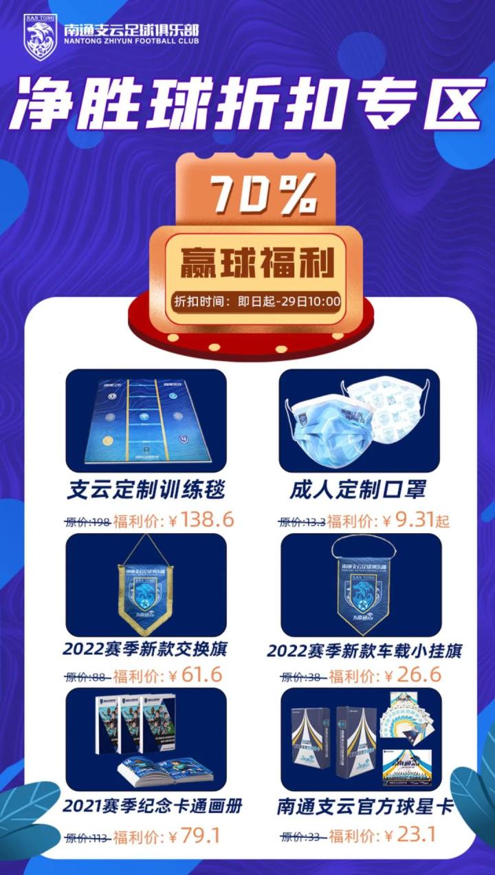 南通支云喜提赛季五连胜,球迷们的福利也来了!支云全平台lifestyle系列产品限时7折庆祝,新款装备85折!印制本场进球球员「特拉奥雷」、「科雷亚」、「雷文杰」的球衣、球迷服印制费半价哦~