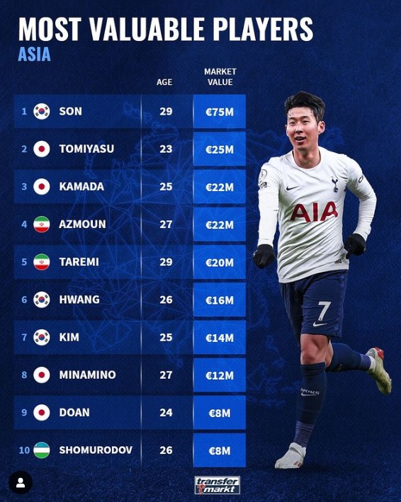 最近德国知名足球数据网站“转会市场”更新了世界足坛球员的身价。“转会市场”列出了亚洲球员的身价排名,热刺的韩国球星孙兴慜以7500万欧的身价高居亚洲球员身价榜第一,排名第二的是日本球星富安健洋的2500万欧。