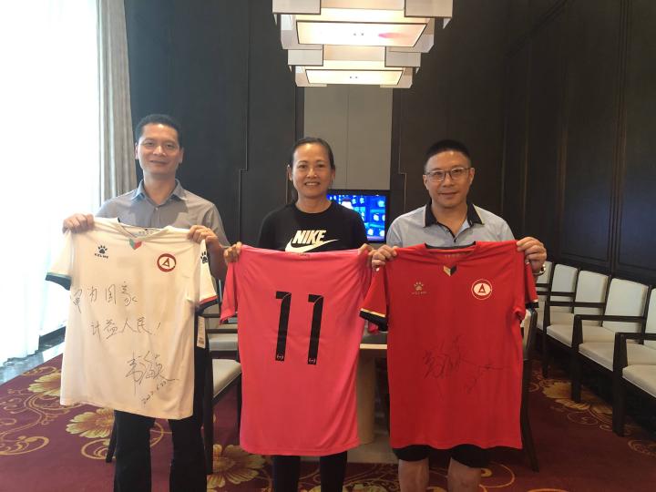 (罗凯文、梁光宁队长向韦海英赠送了球队的11号球衣)