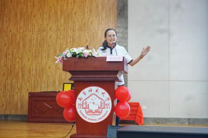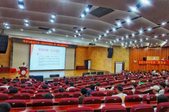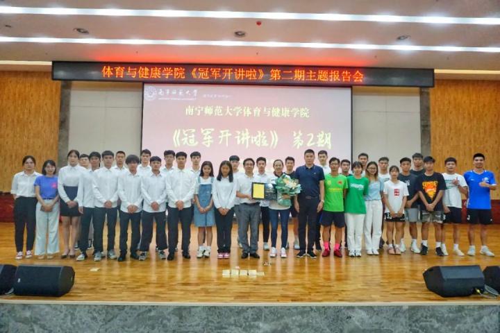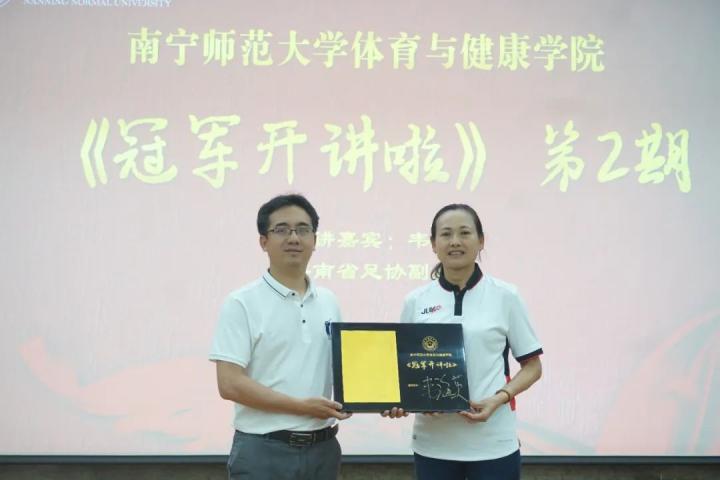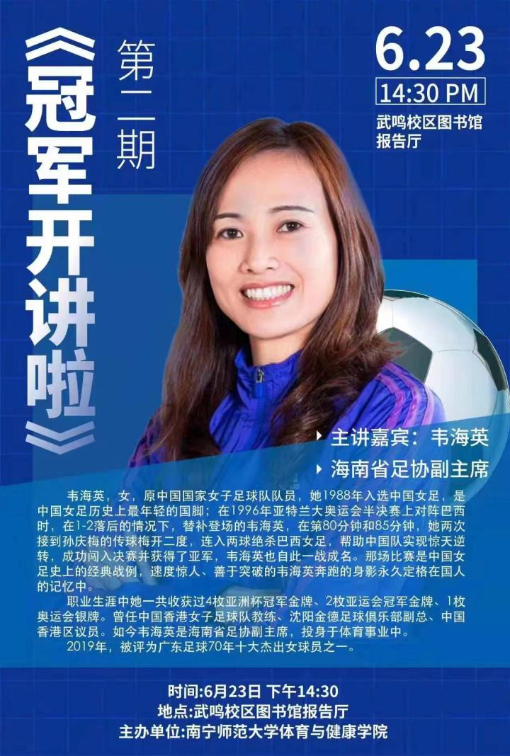 6月23日下午,南宁师范大学体育与健康学院邀请奥运会女足亚军、亚运会冠军、亚洲杯冠军队员、现海南省足协副主席韦海英到武鸣校区图书馆学术报告厅作“冠军开讲啦”第二期报告,报告会由体育与健康学院副书记陈军弟主持,教师代表及250多名同学参加了此次报告会,以提高同学们的人文素养、专业水平和核心竞争力,进一步深化人才培养模式,提高人才培养质量。