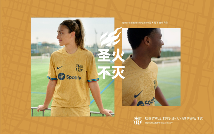 与主场球衣一样,此款客场球衣也以“圣火不灭(The Flame Lives On)”为口号,让人回想起将巴塞罗那这座城市带入新时代的奥林匹克精神仍在燃烧,同时这也是位于加泰罗尼亚首府的男女足日常生活的一部分。