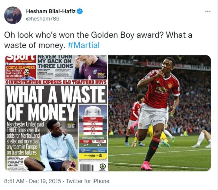 于是在金童奖官宣当天,曼晚记者Bilal-Hafiz饶有兴味地翻出了几个月前英国媒体《镜报》对马夏尔天价转会曼联的报道截图,标题上那行“What a waste of money”的白色大字在如今显得更加醒目。此时此刻,这位记者不忘再来得意地嘲讽一把自己的同行:“看看是谁得了今年的金童奖?还真是‘浪费钱’啊!”