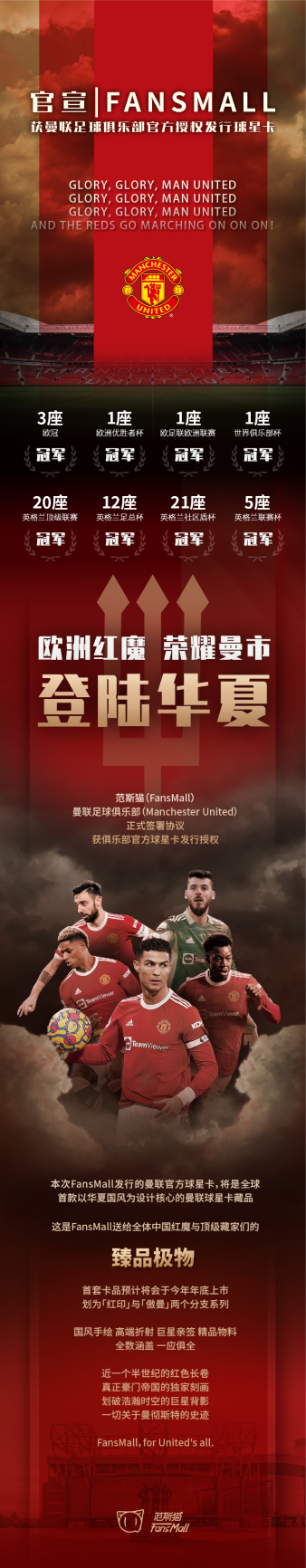 FansMall创始人兼CEO赵京阳先生表示:“我们希望以球星卡为载体,加深与不断增长的球迷群体的紧密联系,为他们带来更近距离的‘红魔’体验。本次合作也将进一步加速FansMall的球星卡发行业务,推动公司围绕IP创造与发行、顶级IP合作、球星卡交易与用户服务,搭建更为完善的球星卡生态,在日益增长的球星卡市场取得品牌与商业发展上的双重成功。”