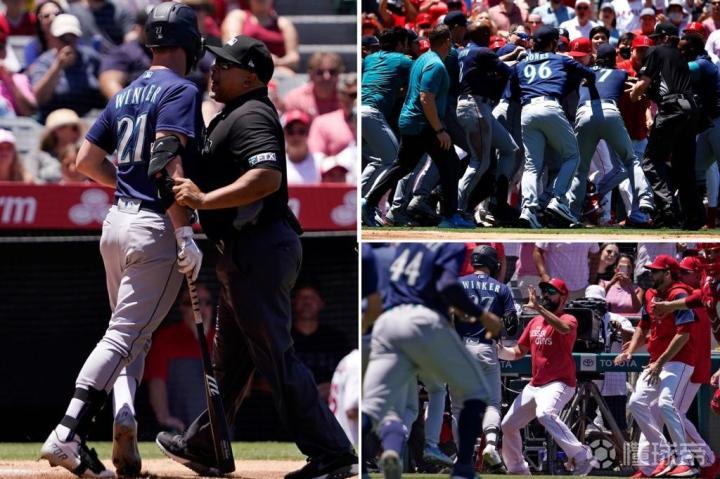在北京时间周一的比赛中,天使主教练赛前临时更换先发,从小联盟拉上一名叫做Wantz的投手投球。该投手连续2局向水手打者投出触身球,在砸到水手27号选手温克(Winker)后,温克对对手非常不满,认为是对方教练指使投手故意而为,遂冲向天使休息区,引发双方板凳清空,双方球员和教练不仅演出大量抱摔镜头,还多次出现拳脚功夫场面: