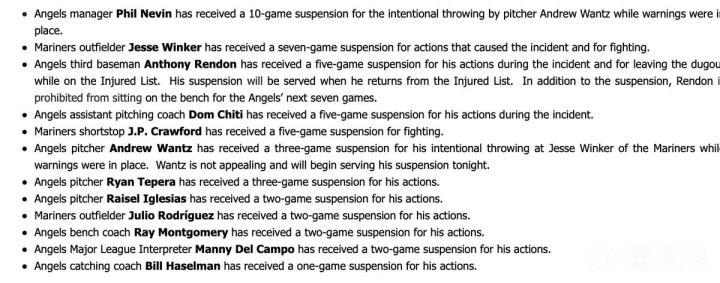 次日,联盟对这场冲突的判决出炉。天使队主教练被禁赛10场,水手队选手温克被禁赛7场,掌掴温克的天使三垒手伦东(Rendon)被禁赛5场,不过此人目前因伤已经赛季报销,禁赛处罚将在他复出后生效;此外,出拳的水手球员克劳福德被禁赛5场,投出触身球的投手Wantz被禁赛3场,另有一名水手打者被禁赛2场;而天使队还另有3名教练、2名投手及1名翻译因为在冲突中的行为而遭到了共计15场的禁赛处罚,联盟为这起事件开除了合计12人47场禁赛的重磅罚单。