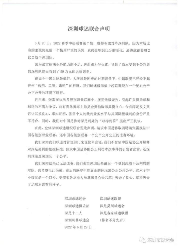 在此,全体深圳球迷组织联合发此声明,请求中国足协取消聘请张雷执法中国各级别职业联赛,还中国各级别联赛一个公平公开公正的比赛环境。