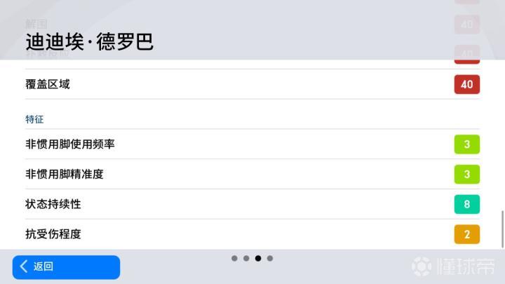 90的速度和99的身体接触,则真正奠定了德罗巴又能跑、又能扛的属性,既能够一骑绝尘而去,又可以与对方进行缠斗,简直就是每个玩家心目中的顶级中锋。
